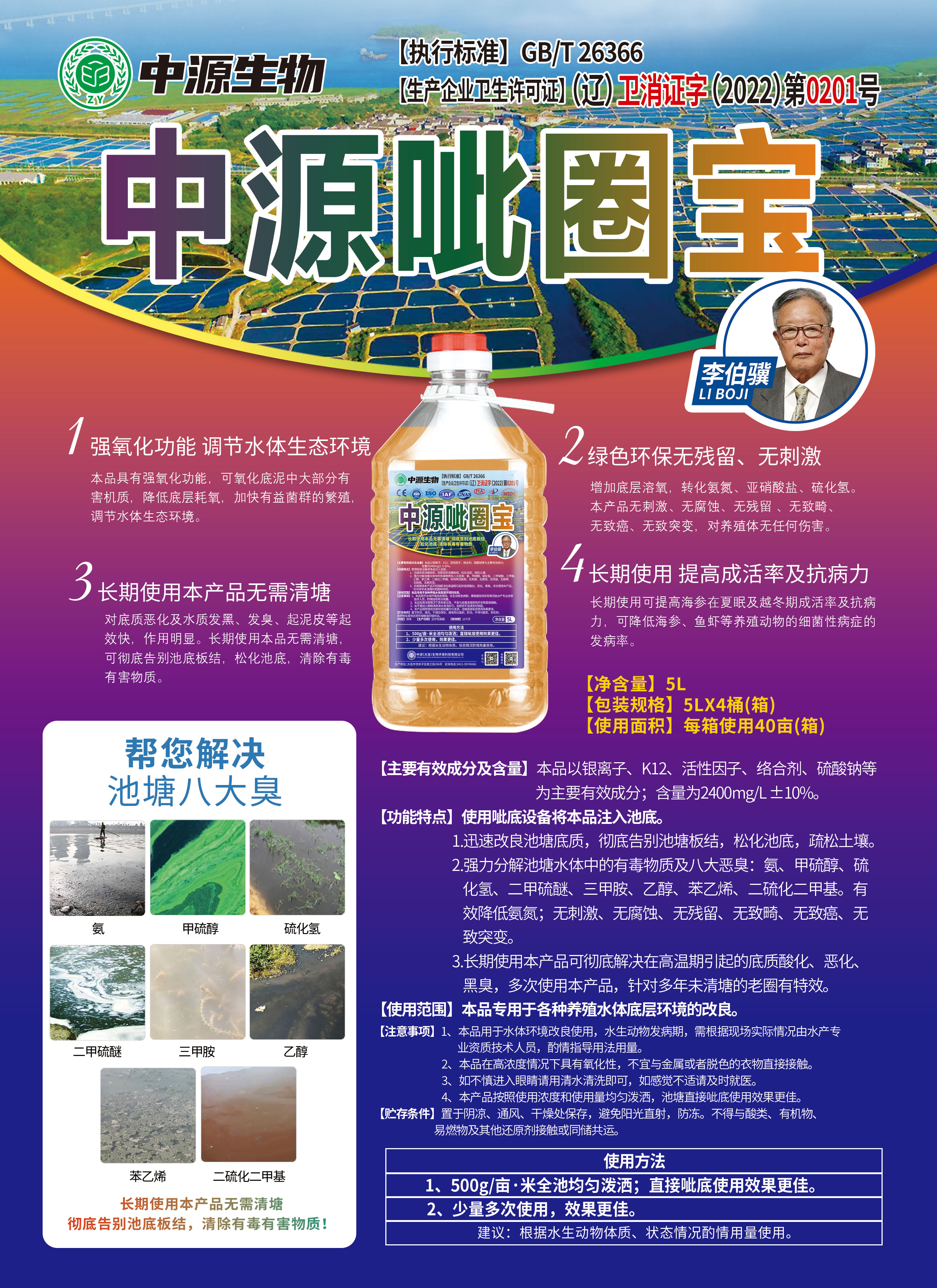 2.强力分解池塘水体中的有毒物质及八大恶臭:氨、甲硫醇、硫化氢、二甲硫醚、三甲胺、乙醇、苯乙烯、二硫化二甲基。有效降低氨氮;无刺激、无腐蚀、无残留、无致畸、无致癌、无致突变