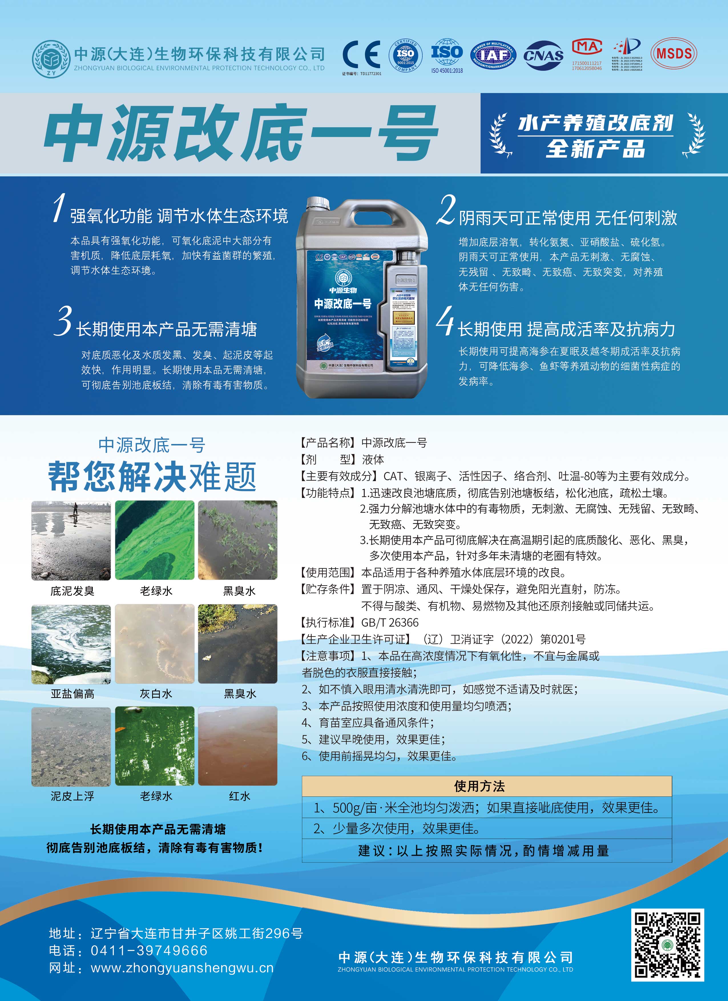 3.长期使用本产品可彻底解决在高温期引起的底质酸化、恶化、黑臭,多次使用本产品,针对多年未清塘的老圈有特效。